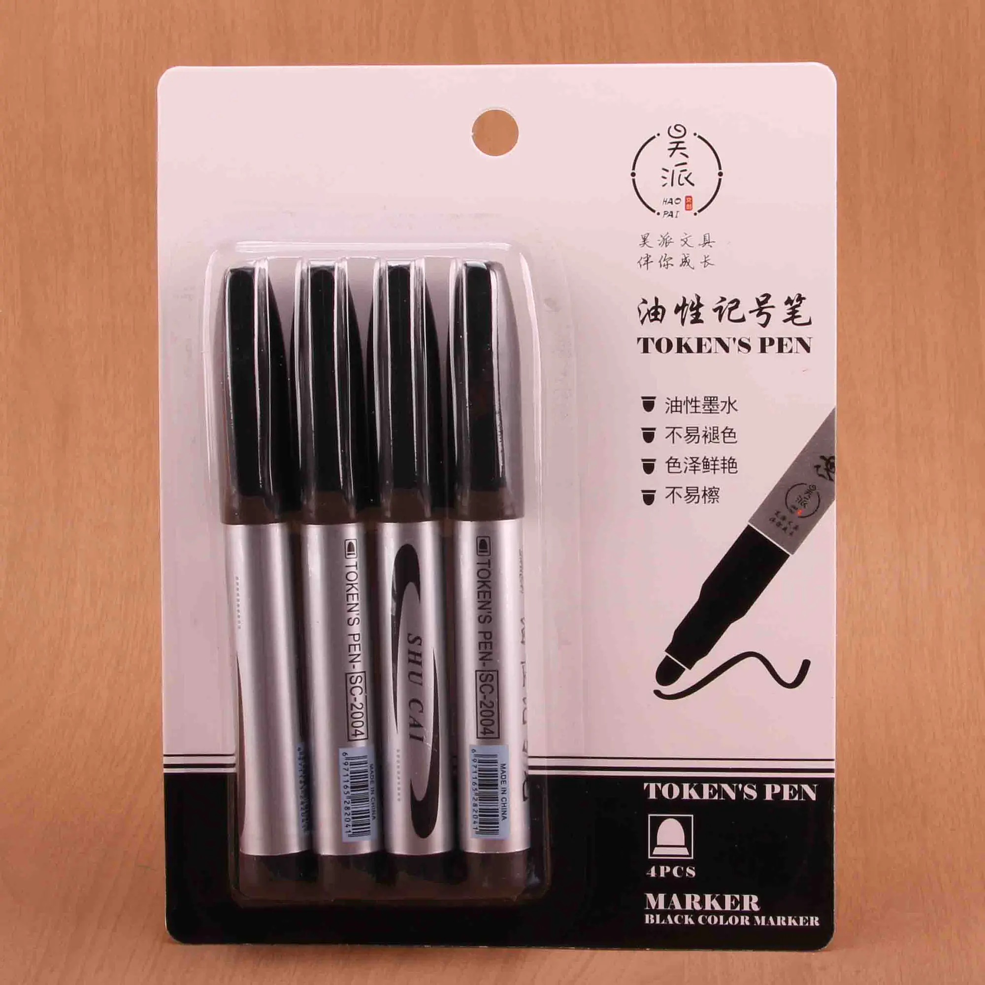 Material: Pen body is plastic; ink is oil-based pigment; nib is fibre. Use: Used for marking on various surfaces such as paper, wood, and plastic.
